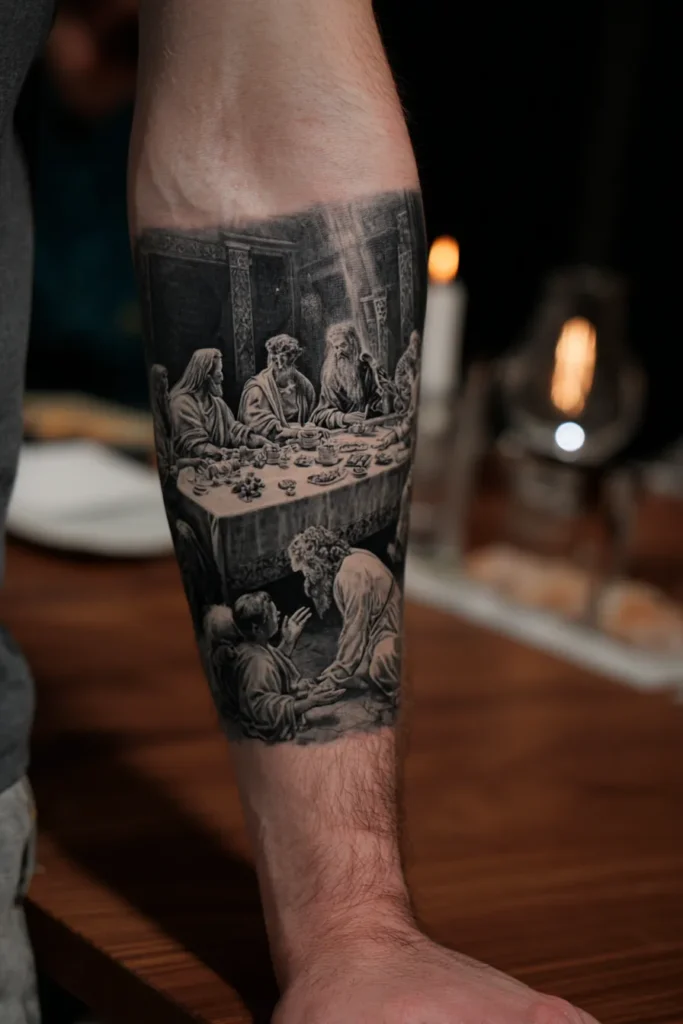 This full forearm tattoo showcases a dramatic black and grey scene of a long banquet table surrounded by robed figures, rendered with incredible realism and depth. Fine shading brings out the folds in the garments, the texture of the tablecloth, and even the soft glow of light streaming from above. The composition wraps naturally along the arm, with layered details that make it feel like a living painting etched into the skin.