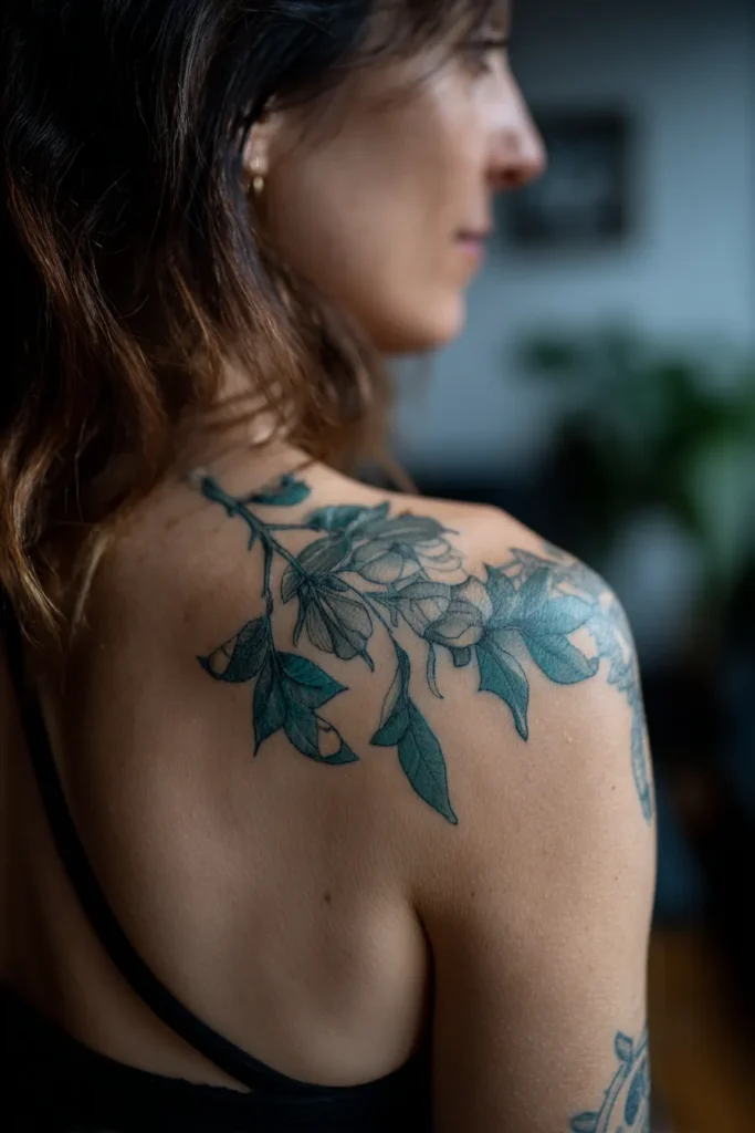 This shoulder tattoo blooms beautifully across the upper back and shoulder blade, featuring flowing branches and leafy details in soft blue green tones. The style leans toward illustrative realism, with gentle shading and natural curves that follow the shape of the body. It is medium in size but makes a graceful statement, especially with the way the leaves extend outward like they are reaching for light.