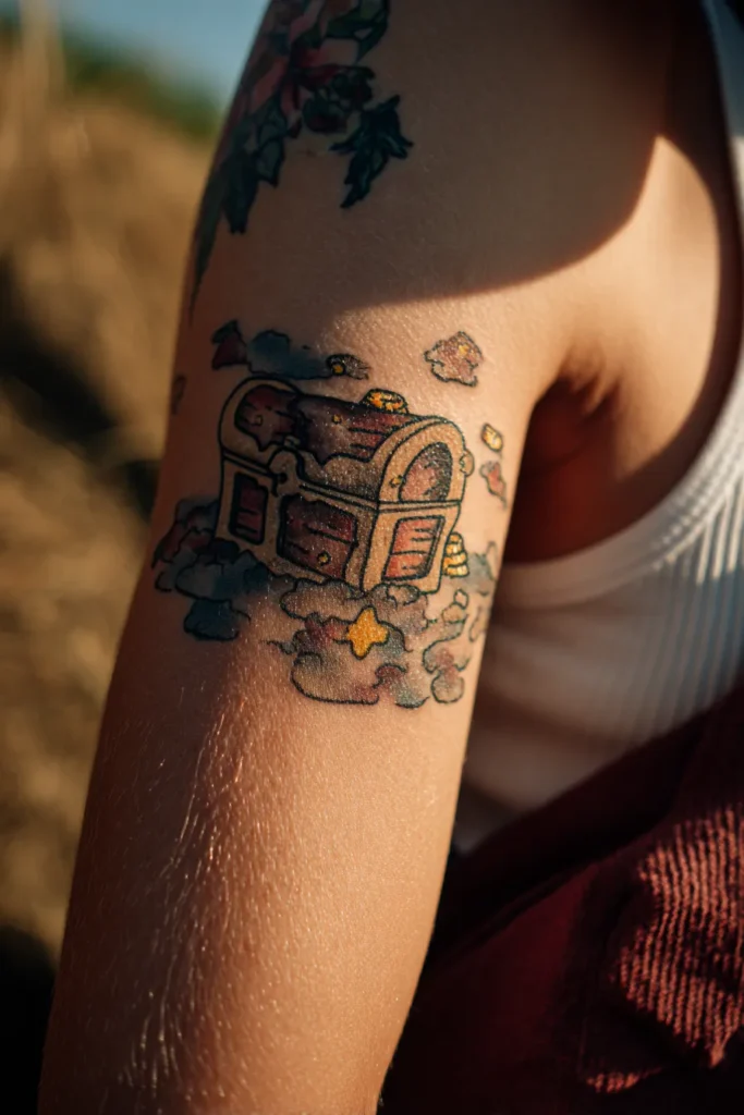 his upper arm tattoo features a charming treasure chest bursting open with gold coins and soft glowing clouds swirling around it. The design is done in a colorful illustrative style, with warm browns, muted reds, touches of golden yellow, and subtle blue grey shading that give it a dreamy storybook feel. Medium in size, it sits beautifully on the outer arm, bold enough to stand out while still feeling playful and whimsical.