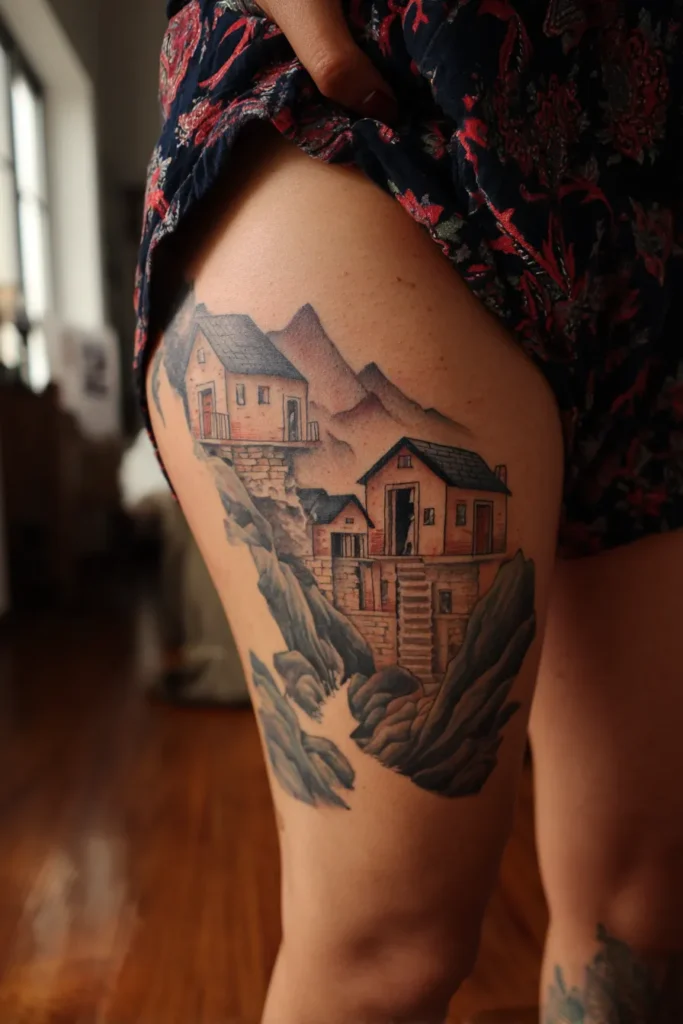 This detailed black and grey tattoo sits beautifully on the upper thigh, featuring a rustic house surrounded by soft landscape elements that feel straight out of a biblical painting. The structure is rendered with fine linework and gentle shading, giving the windows, roof, and wooden textures a realistic depth. Subtle clouds and ground details frame the home, creating a warm, nostalgic atmosphere that feels both grounded and symbolic.