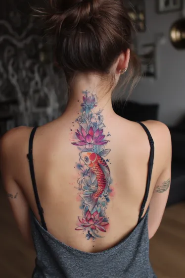 Watercolor Koi Fish and Lotus Spine Tattoo