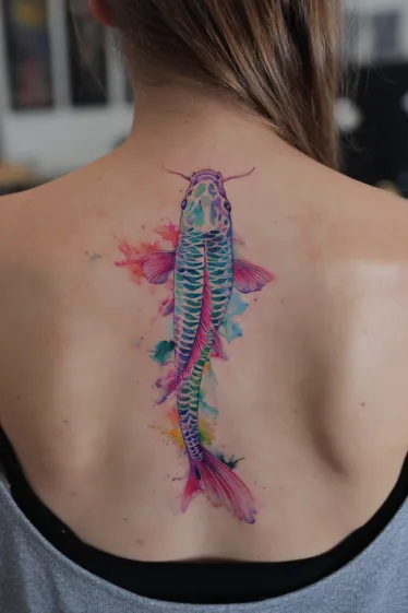 This absolutely stunning spine tattoo features a long, elegant koi fish rendered in a vibrant watercolor style that bursts with color. The fish’s body is a gorgeous blend of blues, purples, and pinks, with delicate scales and fins that seem to shimmer. Around the koi, splashes of pink, yellow, and green ink create a dynamic, watery effect, giving the entire piece a fluid and dreamy appearance as it gracefully swims down the spine.