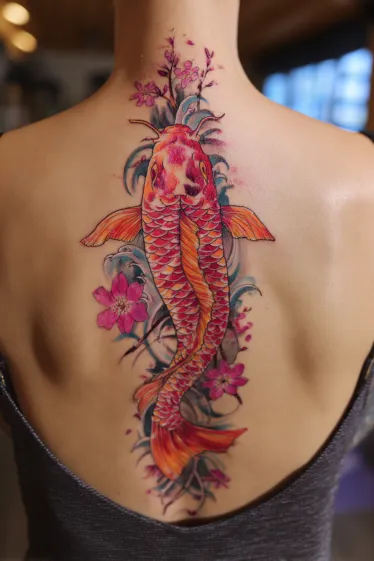I am completely smitten with how feminine and powerful this tattoo looks all at once! The combination of the strong koi with those soft, romantic cherry blossoms is just perfection. It truly celebrates both strength and delicate beauty, which I think is such a wonderful message to carry. Plus, the way it flows along the spine is incredibly elegant, making it feel like a truly special and personal piece of art.