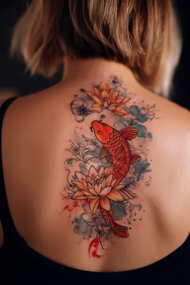 I am completely in love with how serene and vibrant this tattoo is, it is like a little piece of a tranquil pond living on your back. The koi fish symbolizes strength and good fortune, and those delicate water lilies add such a peaceful and pure touch. I think it is perfect for anyone who wants a tattoo that is both deeply meaningful and incredibly beautiful to look at. It is truly a stunning work of art that feels so calming and inspiring!