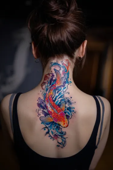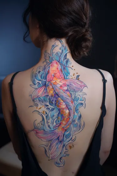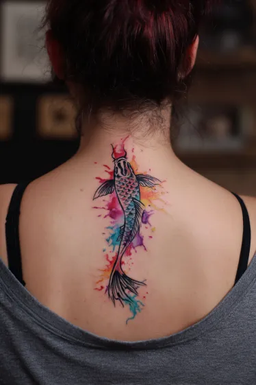 Dynamic Watercolor Koi Fish Spine Tattoo