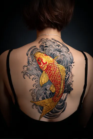 This absolutely striking spine tattoo features a vibrant orange and gold koi fish, swimming powerfully against a backdrop of traditional Japanese-style waves in shades of gray and black. The koi is incredibly detailed, with each scale meticulously rendered, and its flowing fins add a dynamic sense of movement. The bold contrast between the bright, warm colors of the fish and the cool, monochrome waves creates a truly captivating and powerful design that elegantly travels down the spine.