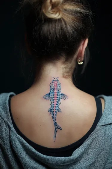 This incredibly unique spine tattoo features a stylized koi fish, depicted with its outer form in cool blues and grays, while its internal ‘spine’ is highlighted in a vibrant, almost glowing pink. The fish gracefully swims downwards along the spine, blending an artistic interpretation of its skeletal structure with the traditional koi motif. It is a modern and intriguing piece that truly stands out.
