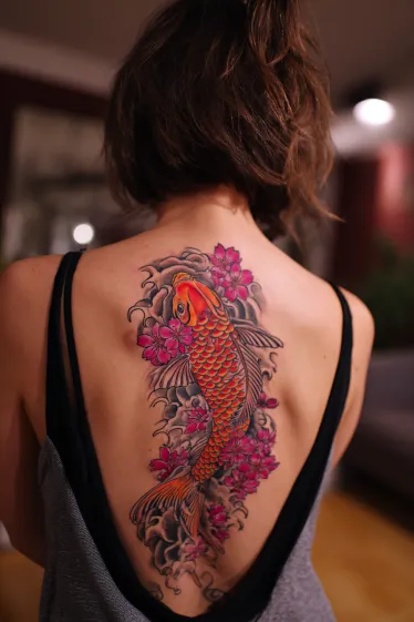 I am completely in love with the sheer vibrancy and symbolic power of this tattoo. The koi fish represents strength and perseverance, which I find incredibly inspiring, and pairing it with cherry blossoms, symbolizing beauty and the fleeting nature of life, creates such a profound meaning. It is like a personal journey of strength and grace etched onto your back, and I think it is just stunningly beautiful and so captivating!