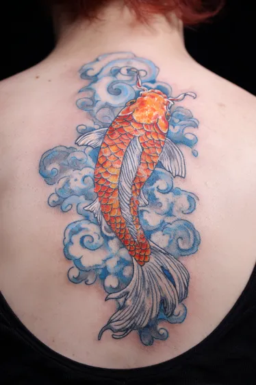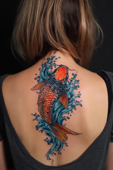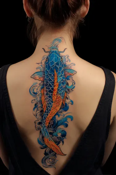 This absolutely captivating spine tattoo features a powerful orange and black koi fish, depicted in striking detail as it battles upwards through vibrant blue waves. The koi’s scales shimmer with warm orange and red tones, contrasting beautifully with its dark back and the cool, dynamic blues of the water. Each wave is rendered with a sense of fluid movement, making the entire piece feel incredibly energetic and alive as it gracefully flows down the spine.