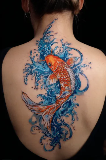 I am completely captivated by the vibrant colors and the sheer force of movement in this tattoo, it is just so eye-catching. The koi fish is such a powerful symbol of strength, perseverance, and good fortune, which I find incredibly inspiring. I love how the blues of the water dramatically frame the fiery spirit of the fish, making it feel like a truly epic journey etched onto your back. This design is perfect for anyone who wants a tattoo that is both deeply meaningful and undeniably a striking piece of art!
