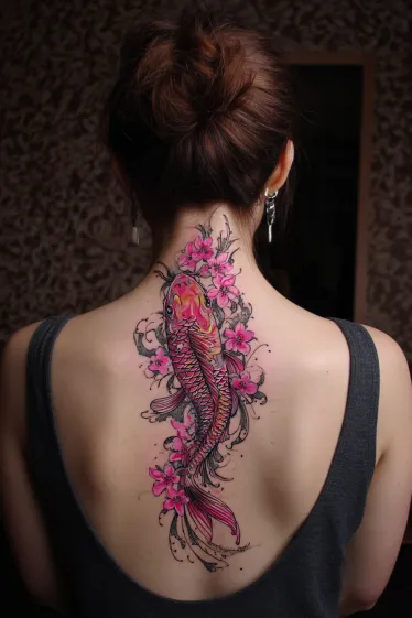 This exquisite tattoo features a vibrant pink and red koi fish gracefully swimming downwards along the spine, beautifully framed by delicate cherry blossom flowers in various shades of pink. Intricate dark swirling patterns and subtle dot work complement the main design, giving it depth and movement. The koi itself has finely detailed scales and fins, creating a flowing and elegant composition that stretches from the nape of the neck down the length of the back.