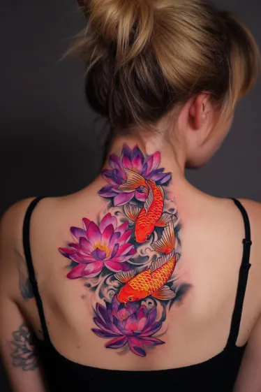 I absolutely love the rich colors in this tattoo! The way the bright orange of the koi really pops against those gorgeous pink and purple lotus flowers is just breathtaking. It feels so harmonious and full of life, perfectly blending strength and beauty, which is why koi and lotus designs are so popular. I think it’s such an incredible way to adorn the back, creating a visually stunning and deeply meaningful piece of art.