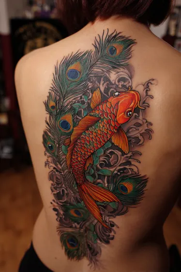 Honestly, I think this tattoo is just spectacular because of the incredible color play. The bright orange of the koi truly pops against the cool greens and blues of the feathers, creating a visual feast that’s hard to look away from. It’s such a brilliant combination of strength and beauty, with the koi symbolizing perseverance and the peacock representing grace and immortality. Plus, the way it perfectly fits the natural curve of the back makes it feel like it was always meant to be there, a truly inspiring piece of art for anyone who loves meaningful and colorful ink.