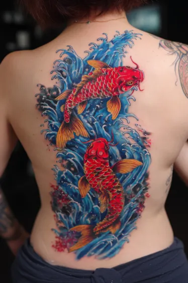 I absolutely adore this tattoo because of its sheer energy and the fantastic contrast of colors. The bright red and gold of the koi against the intense blue of the waves is just breathtaking, making the whole design leap off the skin. It feels so powerful and graceful all at once, and having two koi is often seen as a symbol of good fortune and a happy marriage, which is really sweet. It’s such a bold and inspiring choice for a back tattoo, definitely a conversation starter and a true work of art that captures the eye!