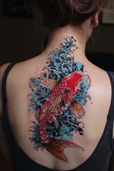 This captivating back tattoo features a single, striking koi fish, predominantly in brilliant red and deep orange hues, with delicate golden accents on its scales and fins. This magnificent fish is depicted swimming against a backdrop of powerful, stylized blue waves that seem to surge around it, creating a sense of movement and energy. The water itself has varying shades of blue, from a light aqua to deeper, darker tones, giving it a watercolor feel as it extends gracefully along the wearer’s back and up towards the neck.