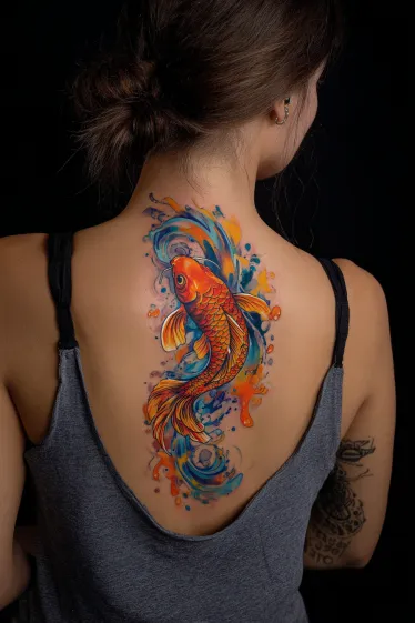 This incredibly artistic back tattoo features a vibrant orange koi fish with lovely golden scales, surrounded by an explosion of dynamic watercolor splashes. The colors are truly breathtaking, with bright blues and aquas swirling around the fish, perfectly complemented by energetic orange and yellow accents that give the impression of water and movement. The koi itself looks like it’s gracefully swimming through this colorful abstract water, with its detailed fins and tail adding to the feeling of fluid motion as the design trails beautifully down the spine.