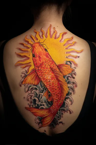 This vibrant back tattoo presents a majestic orange and red koi fish gracefully swimming upwards, perfectly centered against a bright, beaming yellow sun. The koi itself is beautifully detailed with distinct scales and flowing fins, giving it a sense of dynamic movement as it rises. Beneath the fish, subtle grey and white waves add a watery foundation, grounding the powerful imagery of the sun and the koi. The radiant sun, with its warm yellow and orange rays, creates a striking halo effect behind the fish, making the entire design truly glow from the wearer’s upper back down the spine.