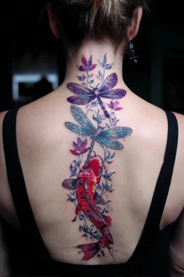 This vibrant spine tattoo features a striking red koi fish gracefully swimming upwards, surrounded by lush botanical elements and two absolutely gorgeous dragonflies. The koi has beautiful details in its scales, with hints of darker red and black creating depth, while its tail and fins fan out elegantly. Above the fish, one dragonfly shimmers in shades of deep purple, and a second one beneath it boasts iridescent blue and teal wings. The entire design is accented with delicate blue-green foliage and soft pinkish-purple blossoms, creating a flowing, garden-like scene that beautifully extends along the back.