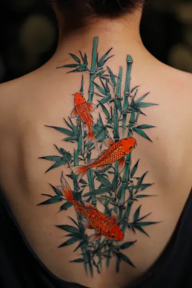 This captivating back tattoo features three stunning orange koi fish, each with beautifully detailed scales and flowing fins, gracefully swimming amongst vibrant green bamboo stalks and delicate leaves. The bamboo is depicted with varying shades of green, giving it a natural, layered look that perfectly frames the dynamic movement of the koi. The design flows elegantly down the spine, with the fish positioned at different levels, creating a wonderful sense of depth and interaction within the natural elements.