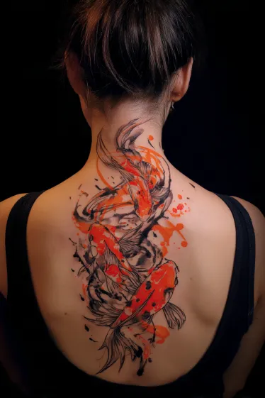 This incredibly expressive back tattoo features multiple koi fish depicted with a stunning blend of traditional ink wash and vibrant watercolor splashes. The koi themselves are mostly outlined in bold black, with sections colored in bright, energetic orange that really pop. They appear to be swirling and dancing amidst dynamic black ink splatters and bursts of orange watercolor, creating a powerful sense of movement and raw artistic flair. This unique design stretches beautifully along the spine, transforming the back into a canvas of motion and color.