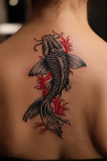 This bold spine tattoo features a magnificent koi fish rendered in beautiful shades of gray and black, giving it a classic, almost ethereal feel. The koi is incredibly detailed, showcasing individual scales and gracefully flowing fins that give it a sense of quiet power. Behind the serene fish, vibrant splashes of bright red abstract shapes create a stunning contrast, making the entire design truly pop. This captivating piece flows down the wearer’s back, perfectly balancing traditional elegance with a modern, artistic edge.