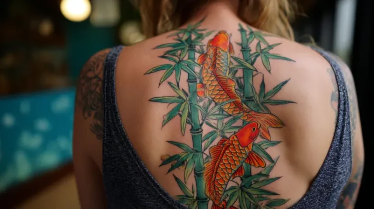 I really think this tattoo is absolutely charming because of its serene yet powerful composition. The bright, cheerful orange of the koi truly pops against the calming green of the bamboo, creating such a harmonious balance of colors. It’s lovely how the bamboo symbolizes strength and resilience, while the koi represents perseverance and good fortune. Together, it makes for such a meaningful and aesthetically pleasing design that feels both peaceful and wonderfully spirited, a fantastic choice for anyone looking for a unique and symbolic back tattoo!