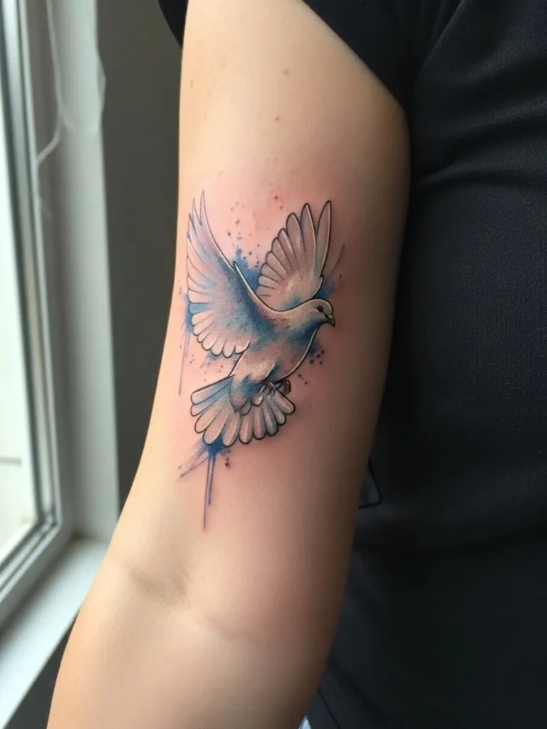 This tattoo sits on the upper arm and features a graceful dove in soft watercolor shades of blush, blue, and muted violet.