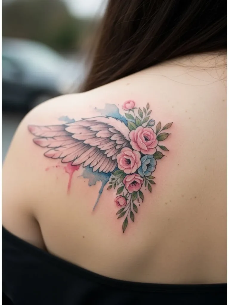This tattoo spreads across the upper back and features a single angel wing adorned with blooming pink roses and soft greenery.
