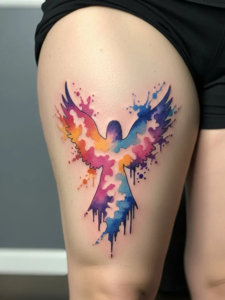 Placed on the thigh, this tattoo features an angel silhouette with wings spread wide, filled with bright watercolor splashes in purple, pink, and blue.