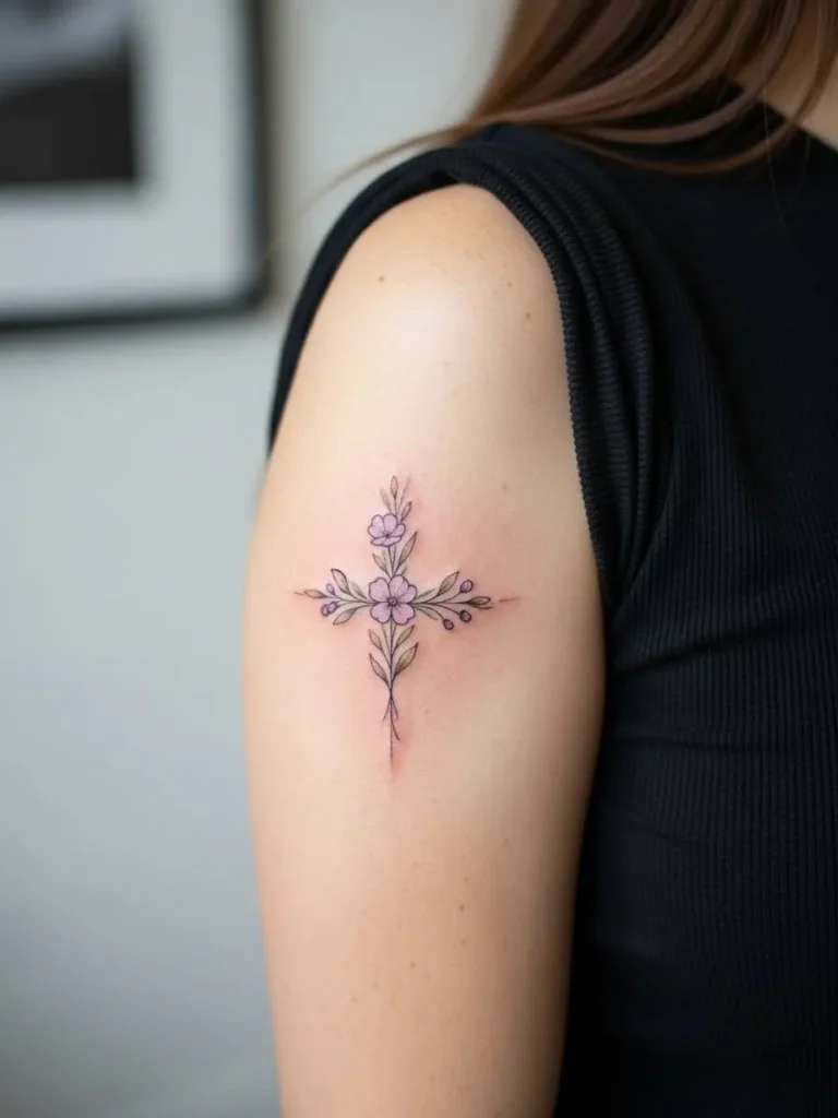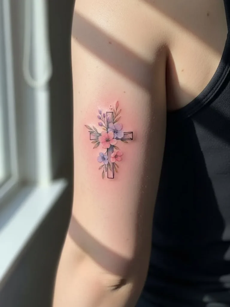 Placed neatly on the upper arm, this tattoo shows a slim cross accented with soft pink and lavender florals.