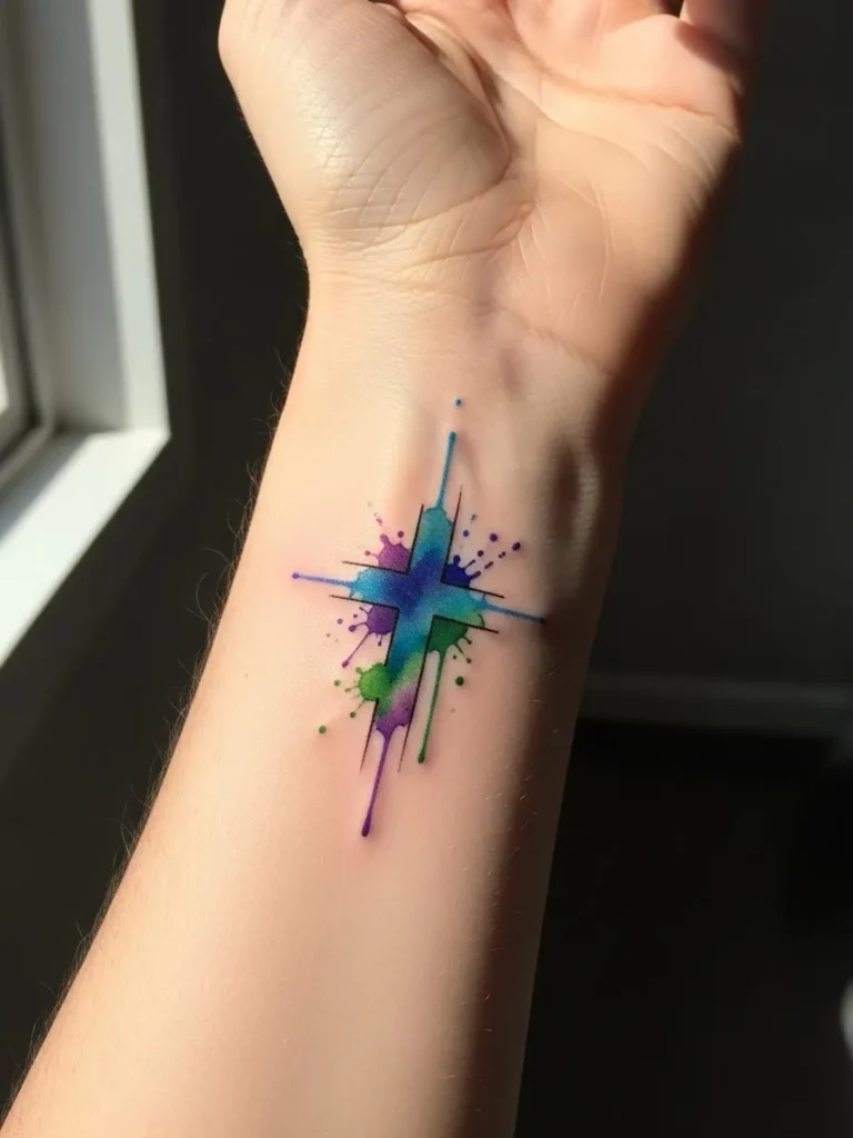 This tattoo is placed on the inner wrist and features a slim cross layered over soft watercolor splashes in blue, teal, purple, and hints of pink.
