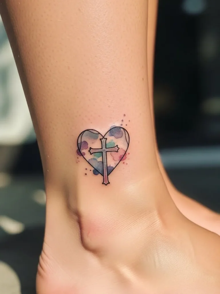 This tattoo rests on the ankle and combines a heart shape with a small cross at the center.
