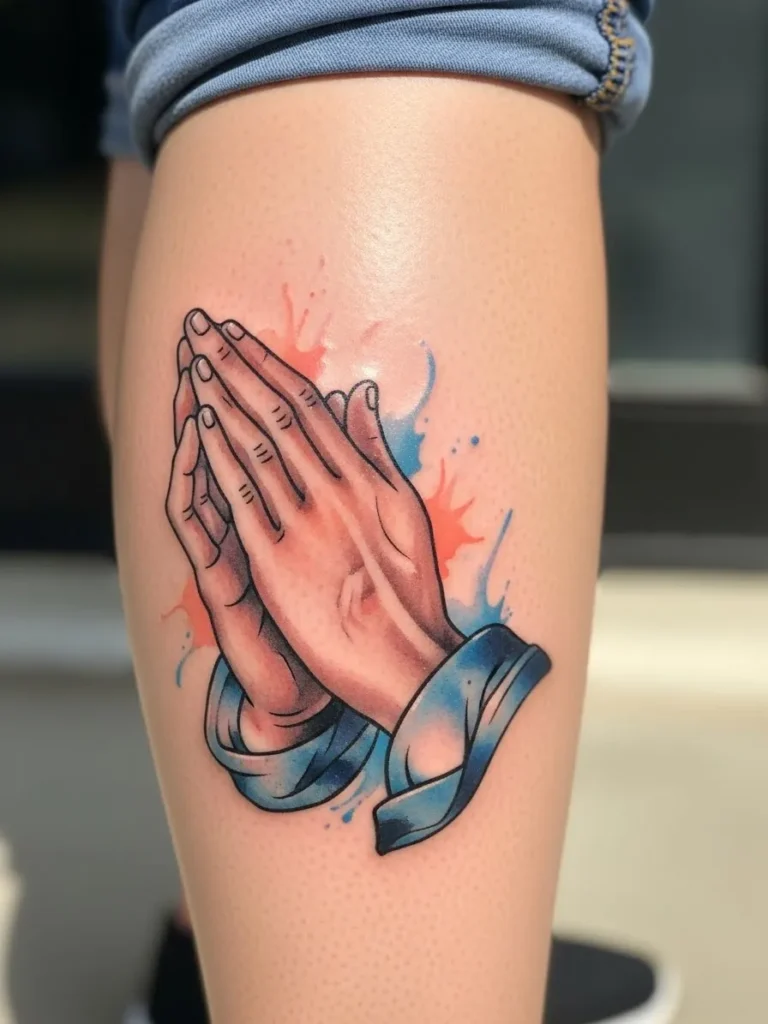 Placed along the forearm, this tattoo features praying hands outlined in fine lines with soft blue and peach watercolor accents.