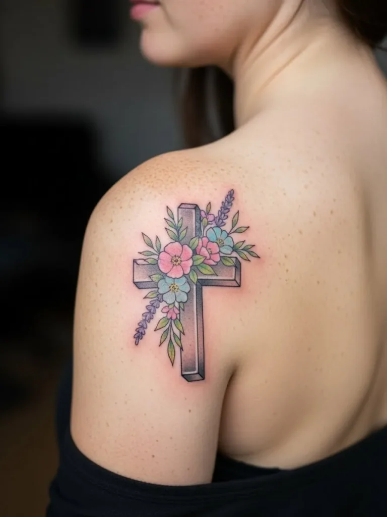 Positioned on the shoulder blade, this tattoo combines a bold cross with blooming flowers in pink and green hues.