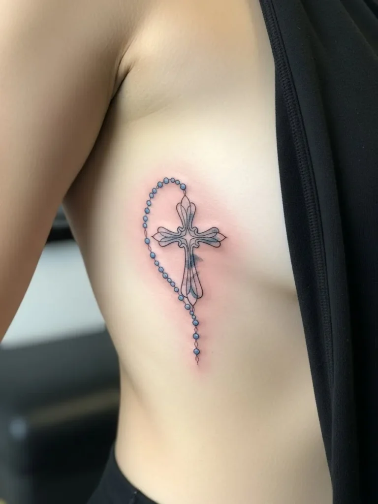 This tattoo sits along the side of the arm and features a rosary inspired cross in soft purple and pink tones.