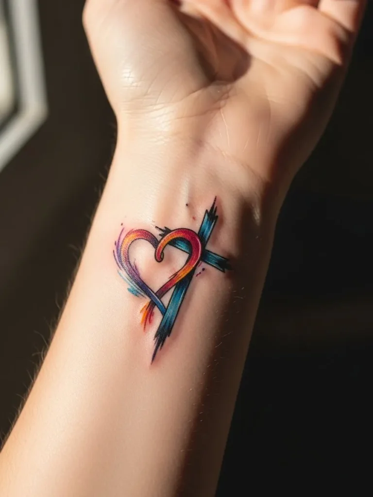 The lines of the cross are clean and minimal, while the surrounding color feels loose and artistic, giving the small design a modern and expressive look.