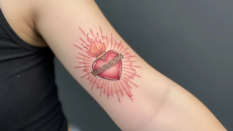 This tattoo sits on the upper arm and shows a sacred heart topped with a glowing flame, surrounded by soft watercolor reds, pinks, and gold tones.