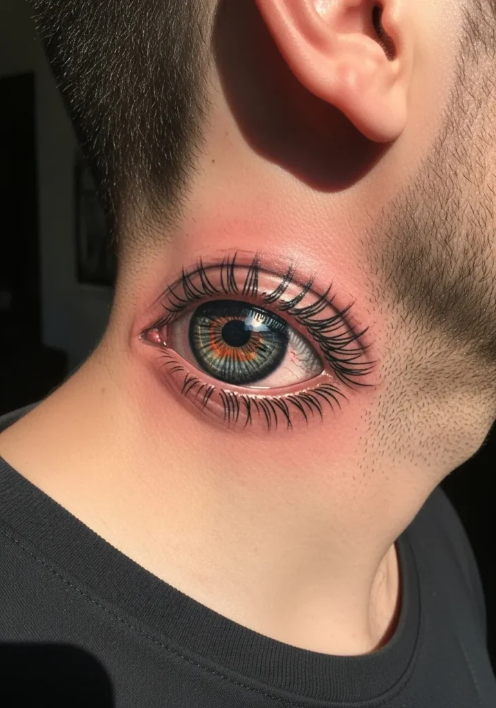 This micro realism tattoo features a hyper-detailed human eye placed just below the ear. The lifelike iris bursts with tones of blue, green, and amber, while delicate lashes and subtle redness make it look almost alive. The smooth shading around the eyelids and skin texture give it incredible depth and realism. It’s small enough to fit neatly along the neck but packs an unbelievable visual punch.