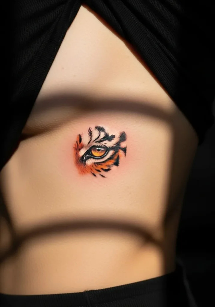 This tiny tiger eye tattoo rests elegantly on the rib area, bursting with vivid orange, black, and gold tones. The fine lines and soft shading make the eye look intense and lifelike, framed by subtle stripes that enhance its wild beauty.