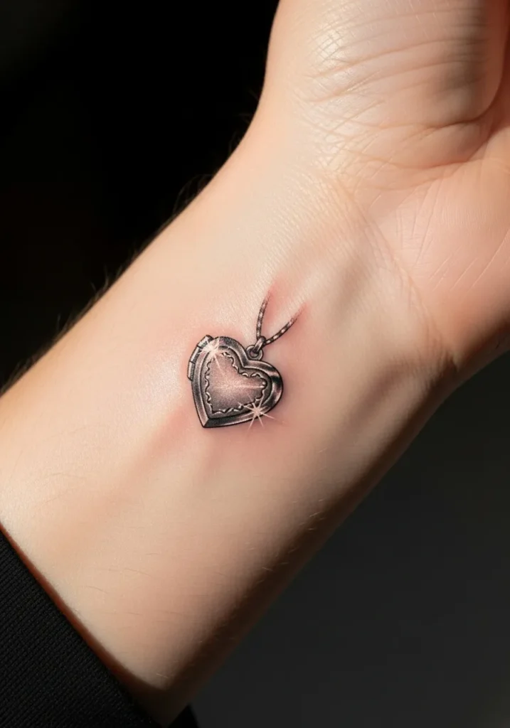 This micro realism tattoo features a metallic heart-shaped locket dangling from a fine chain, placed delicately on the wrist. The silvery shine, engraved details, and subtle shadowing make it look almost 3D. A tiny sparkle highlight adds the perfect finishing touch.