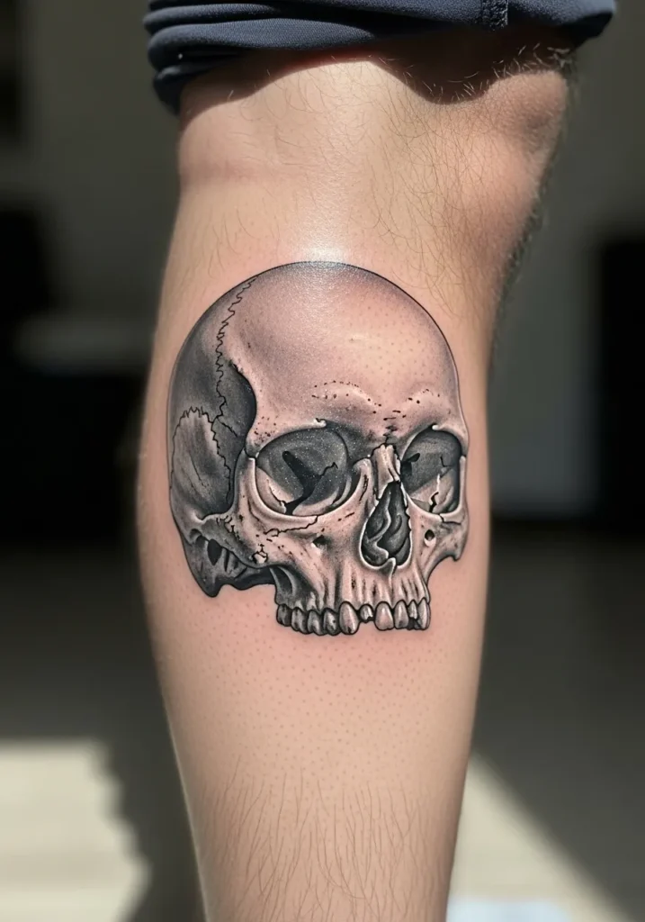 This small skull tattoo sits neatly on the calf, shaded in smooth grayscale with hyper-realistic depth. The cracks, shadows, and subtle highlights make it look sculpted rather than drawn. Despite its size, it commands attention with its striking contrast and texture.