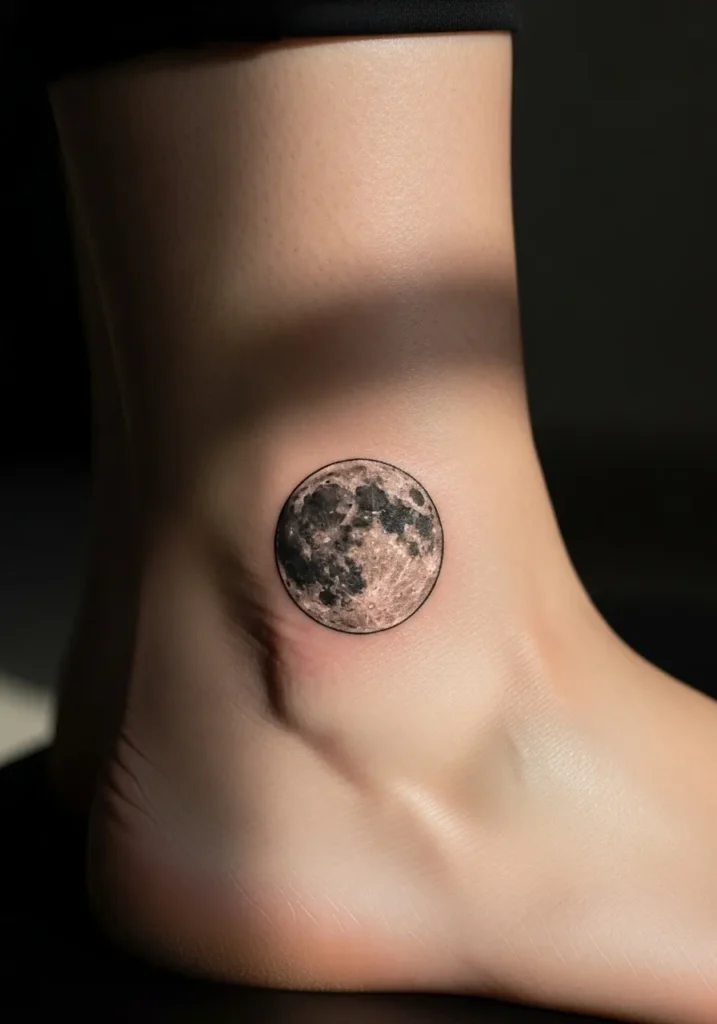 This circular moon tattoo is placed near the ankle, capturing every crater and shadow with soft gray tones. The realistic texture and delicate linework make it look like an actual photograph of the full moon against the skin.