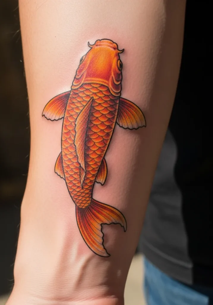 This micro realism koi fish tattoo glows with vibrant orange and golden tones, flowing gracefully along the inner forearm. The delicate scales shimmer with soft highlights, and the fine black outlines give it perfect definition. It’s compact yet dynamic, full of life and motion.