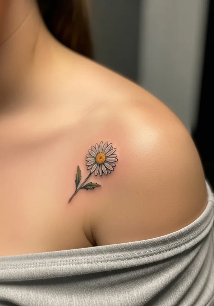 This tiny daisy tattoo sits beautifully on the shoulder, showing off soft white petals and a golden-yellow center with gentle shading that gives it a lifelike glow. The delicate green leaves and thin stem complete the simple yet elegant look. Its placement makes it both feminine and fresh, catching the light perfectly on bare skin.