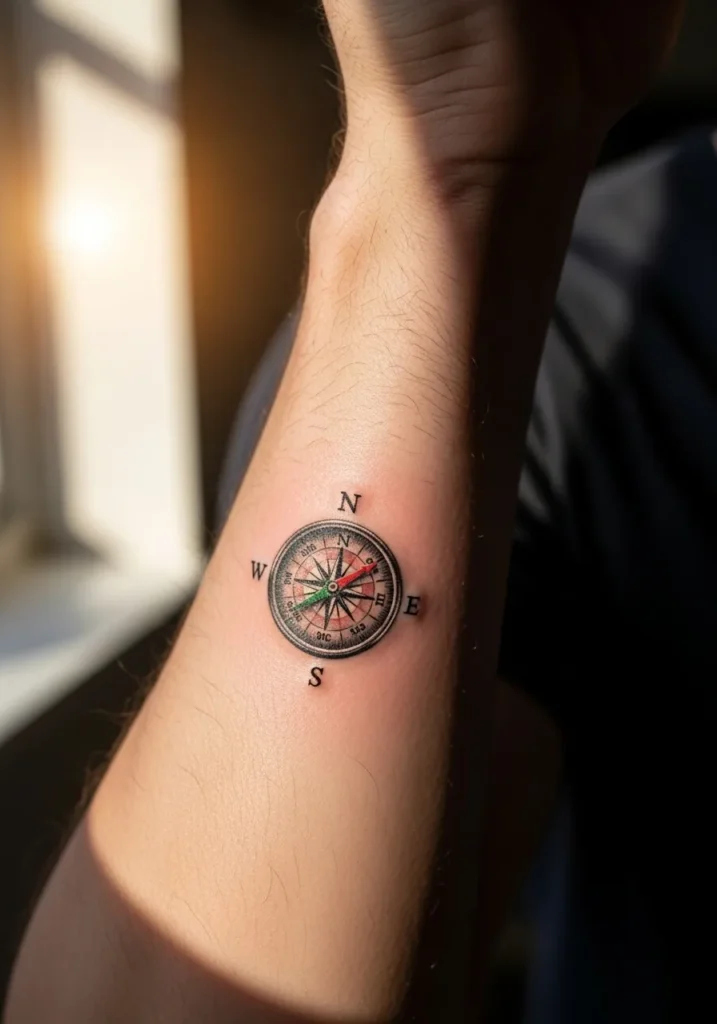 This small compass tattoo is placed neatly on the inner wrist, featuring a circular design with ultra-fine detailing in the needle and directional letters. Subtle shading and hints of red and green make it look metallic and realistic, as if it could actually guide your way.