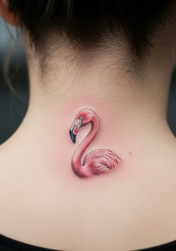 This charming flamingo tattoo rests at the nape of the neck, with shades of pink and coral that blend seamlessly to mimic soft feathers. The slender neck and elegant pose give it a graceful touch, while the delicate linework keeps it refined and subtle.