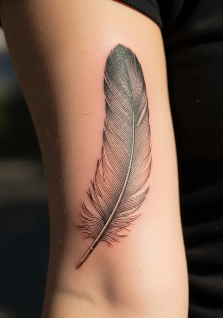 This micro realism feather tattoo lies along the upper arm, rendered in fine grayscale shading that captures every tiny strand and texture. The soft gradient from dark to light gives it depth, making it appear as though it’s resting gently on the skin.