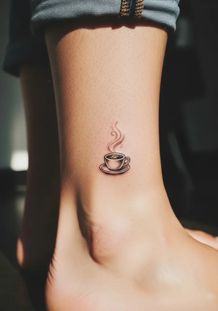 This miniature coffee cup tattoo sits near the ankle, complete with a saucer and soft steam rising above it. The light shading and crisp lines make it look so realistic you can almost smell the coffee.