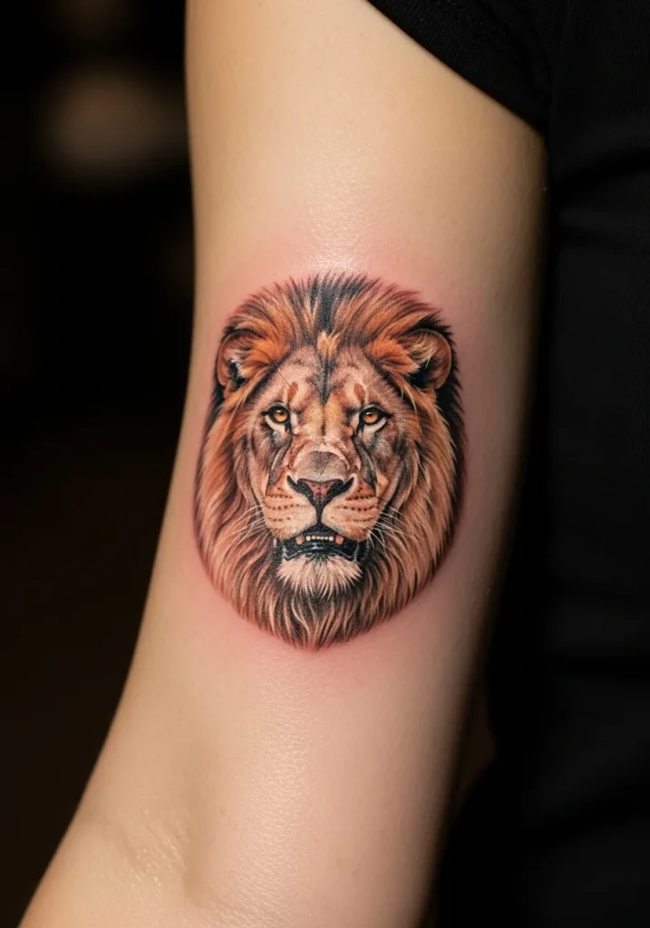 This miniature lion tattoo is pure micro realism magic. Inked on the upper arm, the piece captures every strand of fur and the intensity in the lion’s golden eyes. The warm brown and amber tones blend seamlessly, creating the illusion of soft fur with realistic depth. Despite its size, the detail is incredible, right down to the whiskers and subtle highlights on the nose.