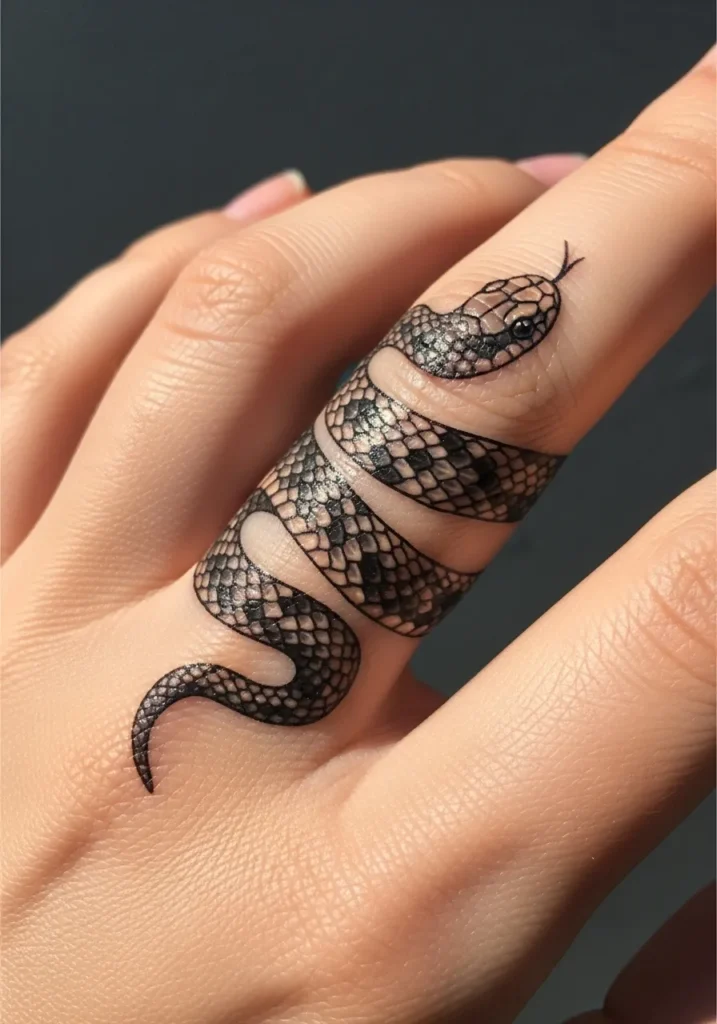 This intricate snake tattoo coils perfectly around the finger, with hyper-detailed scales and subtle highlights that give it a 3D effect. The small head peeking forward adds personality and a bold edge to the delicate design.